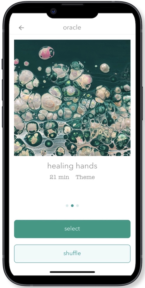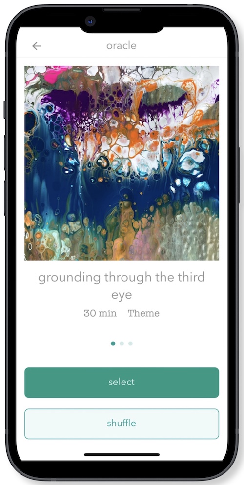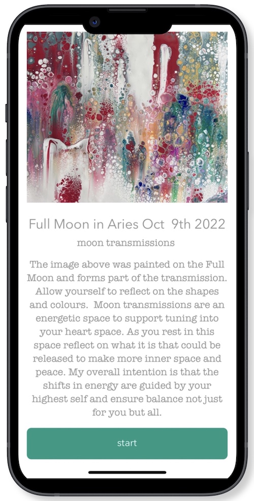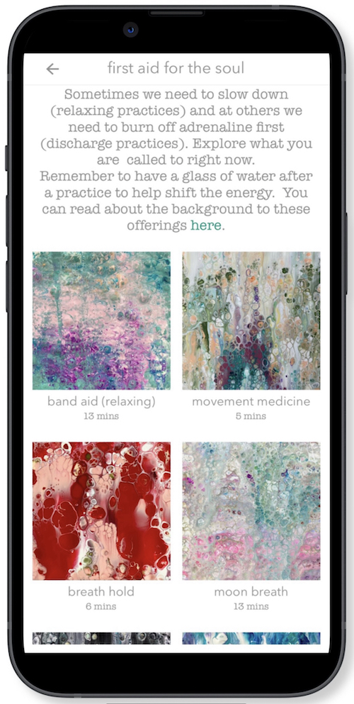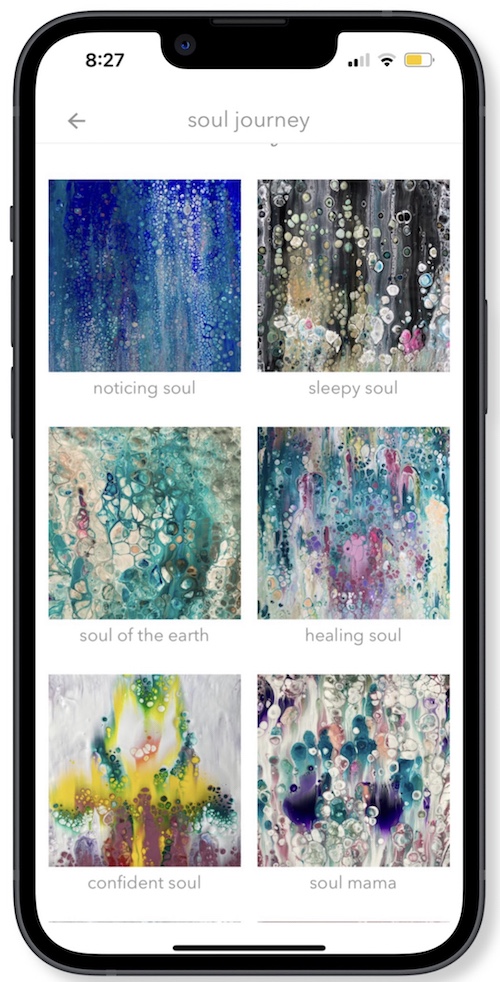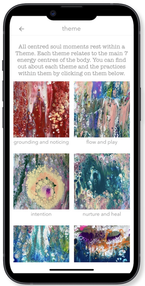 Each centred soul moment has its own painting as an icon (visual transmissions). In this way, the practises are offered through a landscape of colour inviting users to navigate its offerings by what they are drawn to.