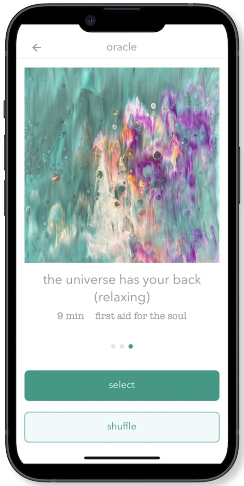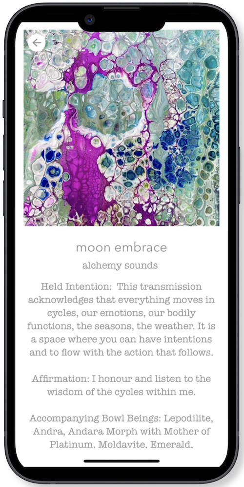 These features really support choosing your centred soul moment intuitively by moving with the images you are drawn to. This is like picking an oracle card where you tune into your heart space and then press shuffle. You can create your own intuitive reading through the titles and images or listen to the suggested three centred soul moments. Another way to do this is through the Gallery feature where you just scroll through the images to one you are drawn to then press play. Find out more on the visual transmissions here.